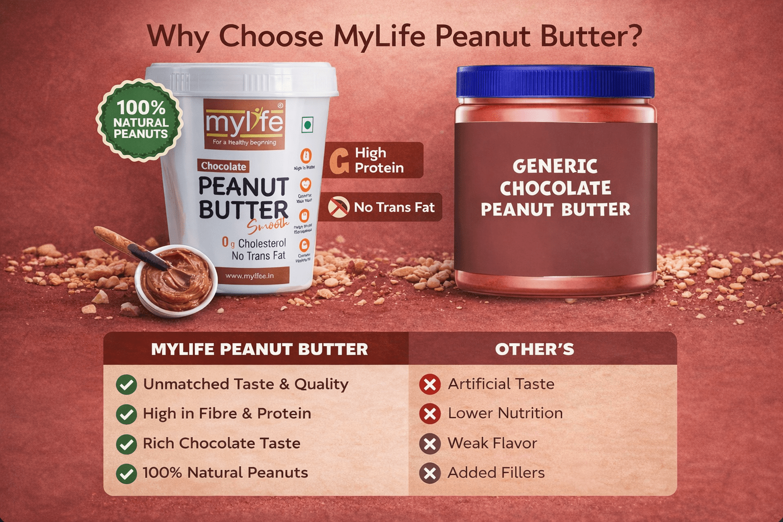 Indulge in the rich and creamy goodness of MyLife Chocolate Peanut Butter Smooth, perfectly crafted for both taste and health. Made with premium roasted peanuts and a delightful chocolate twist, this smooth peanut butter is high in protein, contains healthy fats, and has 0g cholesterol and no trans fat.